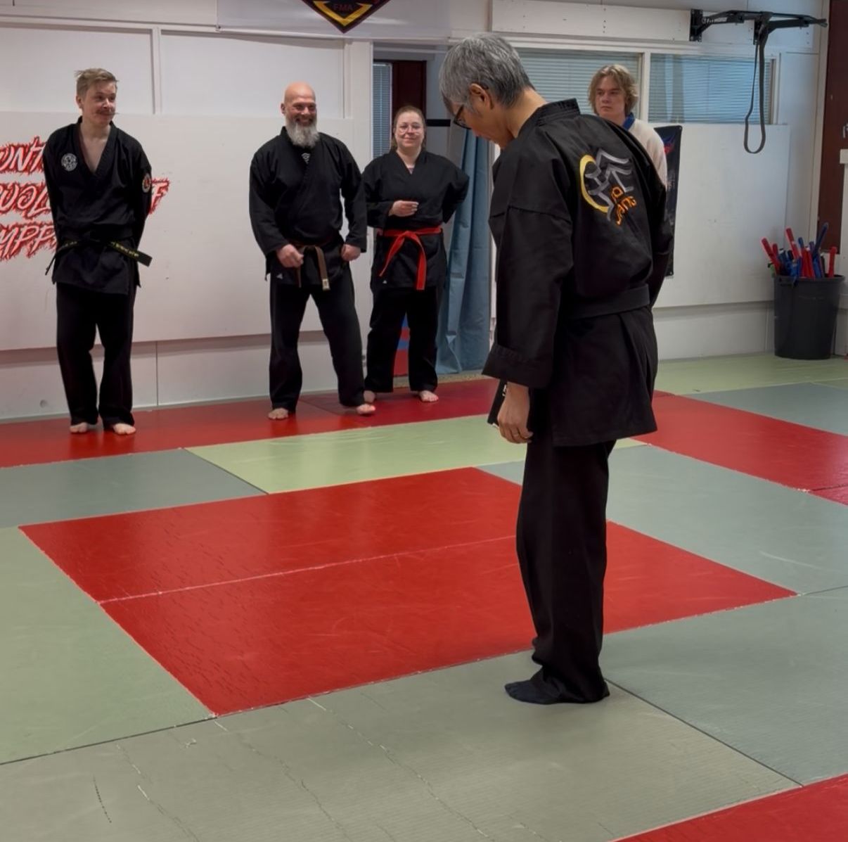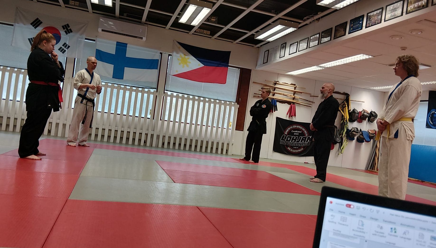 Tauon jälkeen In Seon kertoi Moo Do in -arvoista ja kävimme uudistettua harjoitusten runkoa läpi osio kerrallaan. Hauskuus oli tämän osion avainsana, ihan mahtavia ideoita. (Ei sillä, että meidän normitreenit menis mitenkään vakavalla naamalla muutenkaan 😀 )